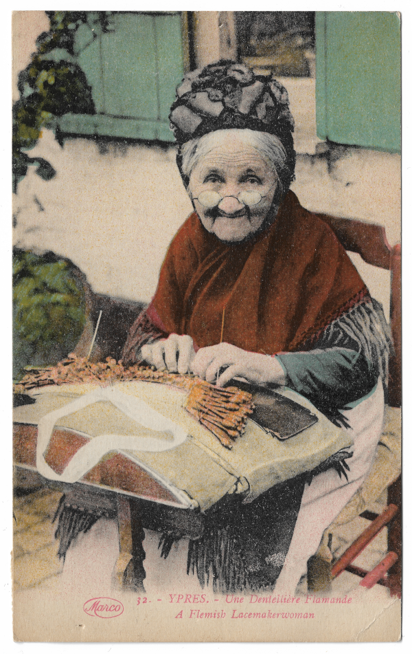 "Marco" postcard, sent from Brussels, Belgium to San Francisco, California in 1929, depicting a venerable "Flemish lacemakerwoman" (Hallaert Sœurs?), shawled, bespectacled, and wearing a most interesting hat. She looks incredibly crafty, with clever fingers. Just look at how many bobbins she has employed all at once...!