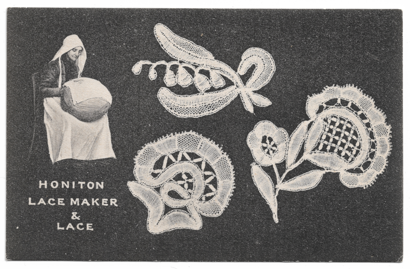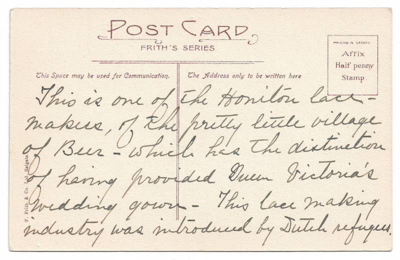 detailing the history of Honiton lace, which originates from Devon, England. However, the anonymous writer on the back of this postcard has also kindly provided us with a succinct little glimpse into the world of English textiles—effectively transforming this ephemeral bit of paper itself into a minor artifact of history.